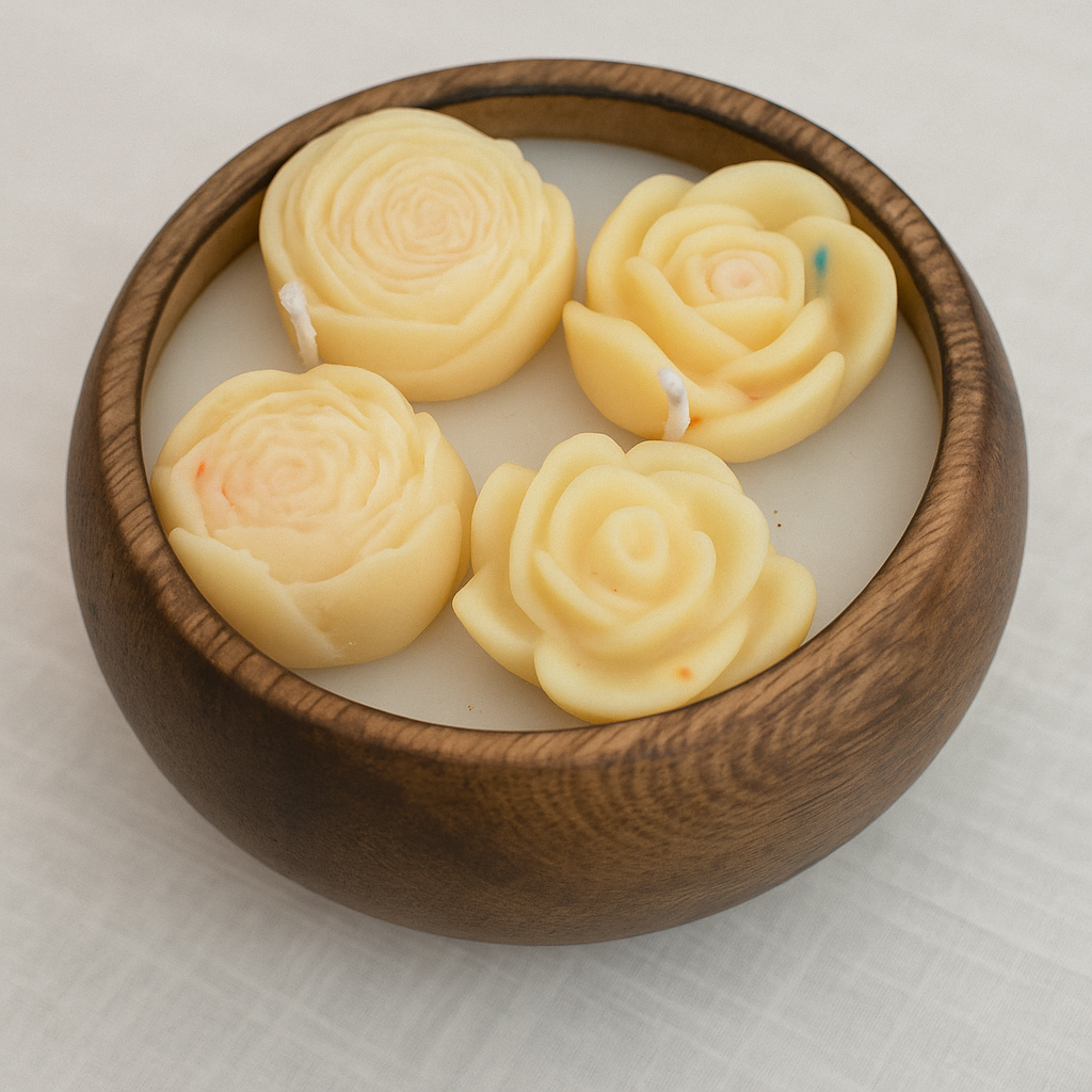 • Beautiful wooden bowl filled with floral-shaped candles.